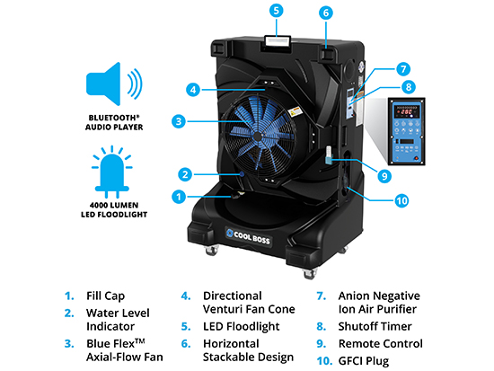Cool Boss COOLBLAST™ evaporative air coolers provide instant comfort solutions by using water evaporation to instantly chill areas at a fraction of the cost of traditional air-cooling methods.