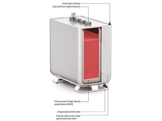 Granby tanks provide a double wall solution for lubricants, waste oil, washer fluid, ATF, heating oil and diesel blends up to B100. Constructed of a fluorinated internal HDPE tank and galvanized steel external tank with sturdy integrated galvanized base, these units optimize tight space utilization. With two tank sizes available, both are suited for areas with headroom as low as 60” and narrow doorways as narrow as 28” wide. Easily add fluid fill and dispensing equipment with the top mount bracket kit.