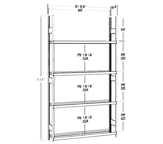 Tire Rack Starter. 60" wide x 15" deep x 111" tall, four levels. Holds 20 tires.