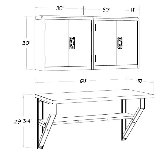 Two wall-mounted cabinets and one wall-mounted shelf. Ideal for keeping floor space clear and clean. 60"W x 30"D.